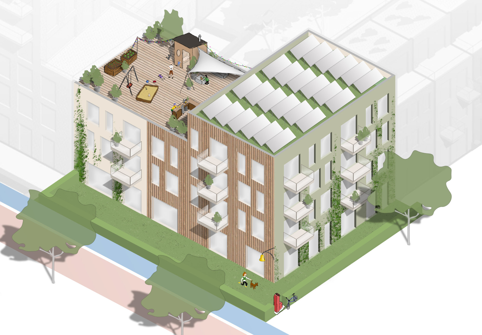 Soweit wirtschaftlich umsetzbar, prüfen wir außerdem den Einsatz von Holz, Lehm und einer Korkfassade als CO₂-speichernde Baustoffe. Zur Förderung eines positiven Raumklimas sind eine großflächige Fassadenbegrünung sowie ein Dachgarten vorgesehen. Ergänzend werden wir durch Infrastrukturmaßnahmen wie Mulden oder Rigolen einen Beitrag zur Wasserrückhaltung leisten und so die klimawandelangepasste Entwicklung des Quartiers unterstützen.
